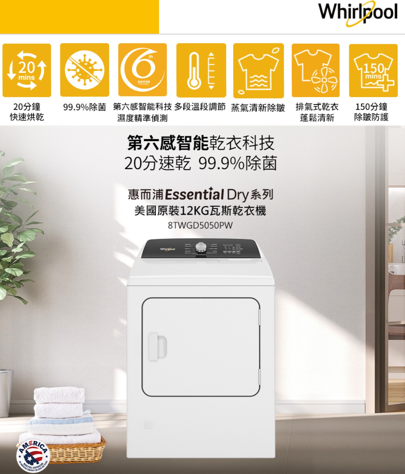 【Whirlpool 惠而浦】12公斤 快烘瓦斯型乾衣機(8TWGD5050PW)