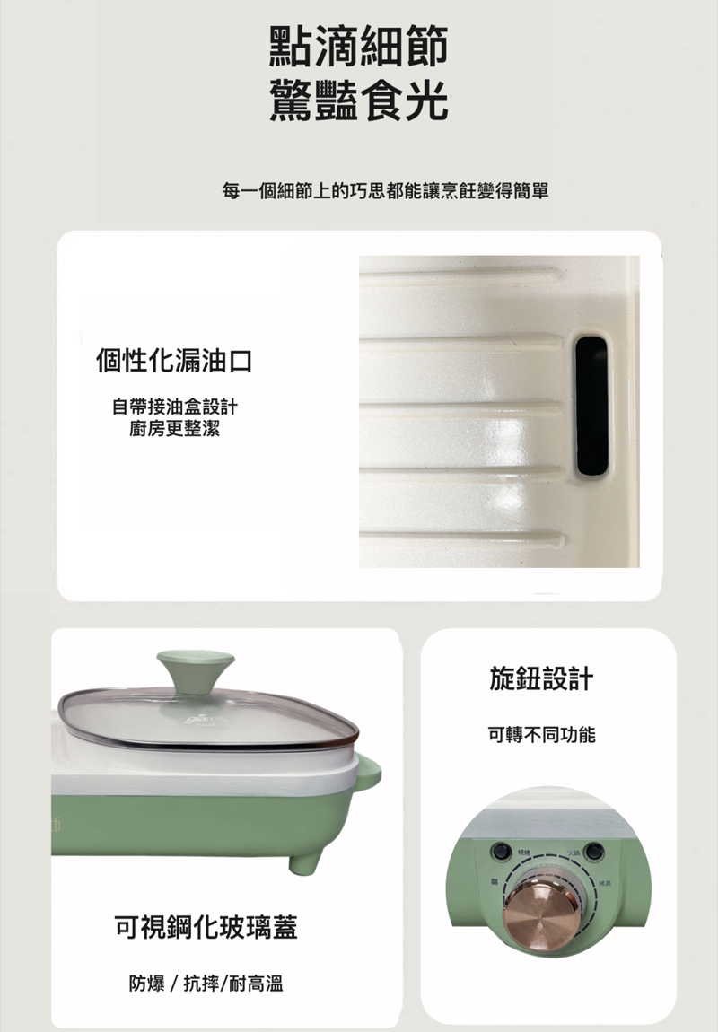 ◆ 不沾陶瓷塗層,降低油煙加熱均勻,調理好清洗 ◆ 4段開關控制設計旋鈕 ◆ 可烤肉、涮烤、火鍋調理同時進行,也可單獨使用 ◆ 溫度過熱保護裝置 ◆ 獨立濾油引流槽設計,耐熱玻璃蓋