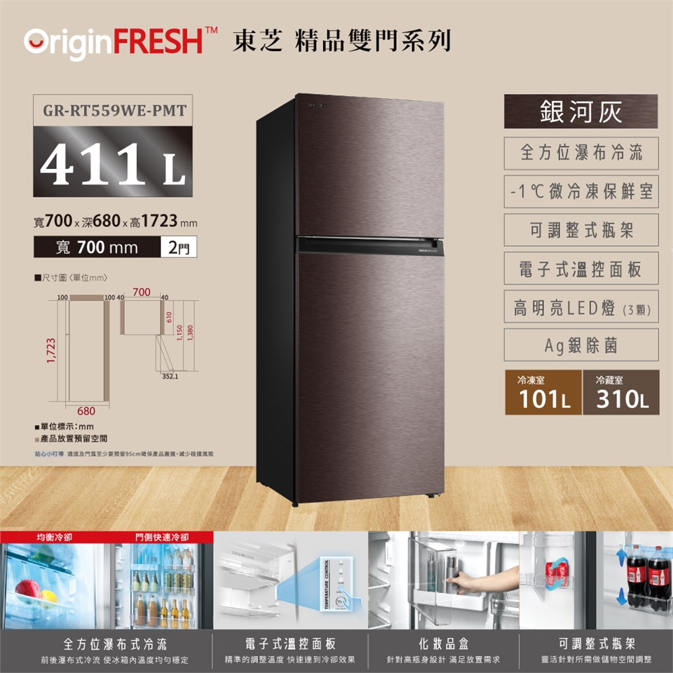 【TOSHIBA 東芝】411公升原味覺醒精品系列 變頻雙門冰箱(GR-RT559WE-PMT)