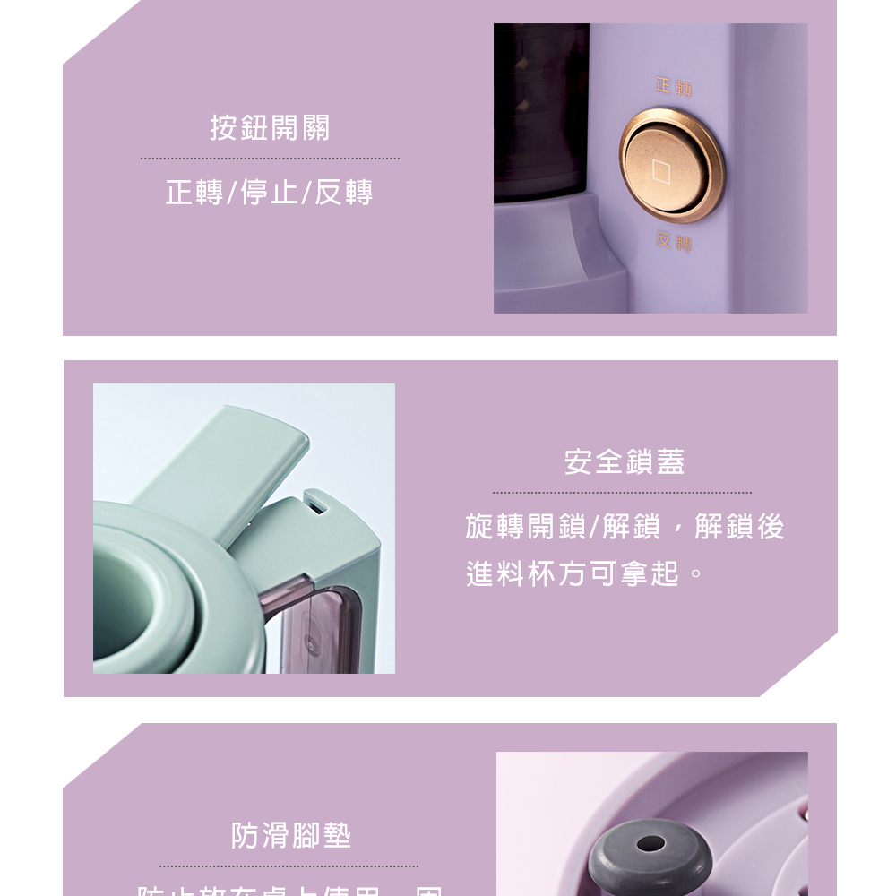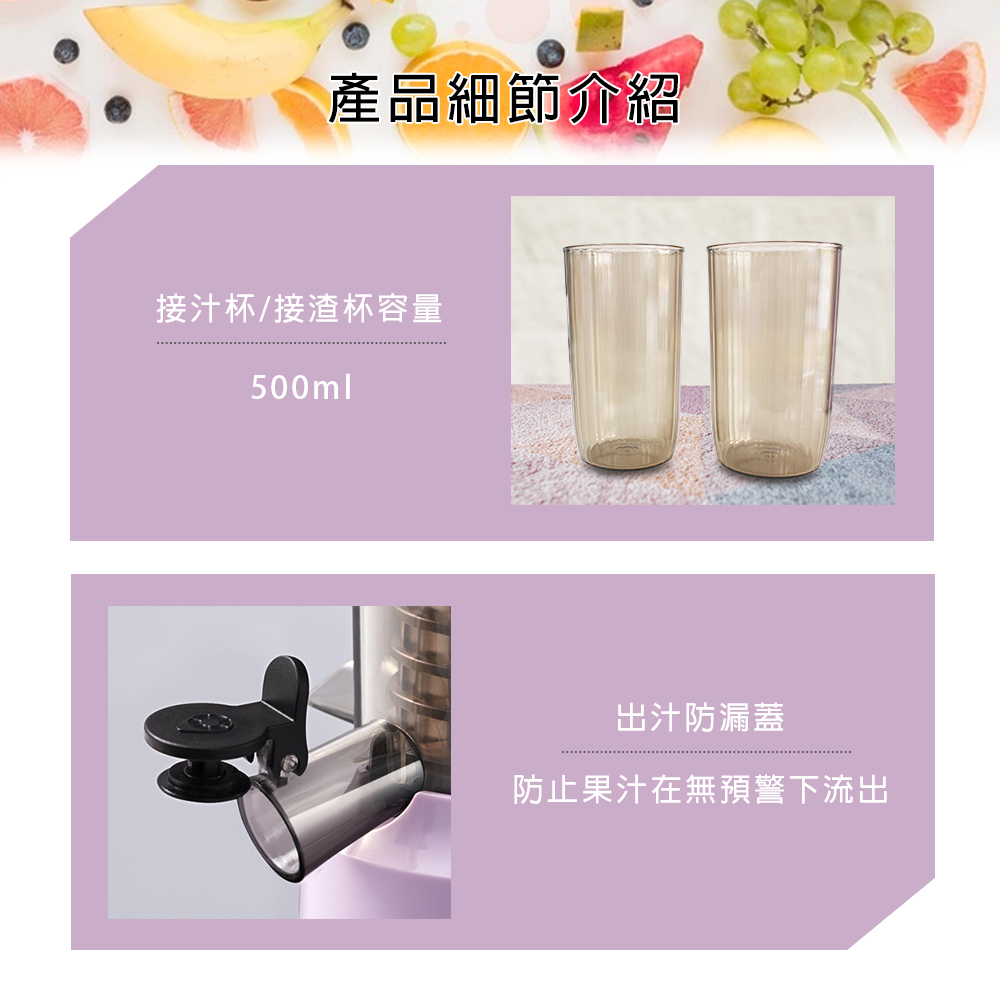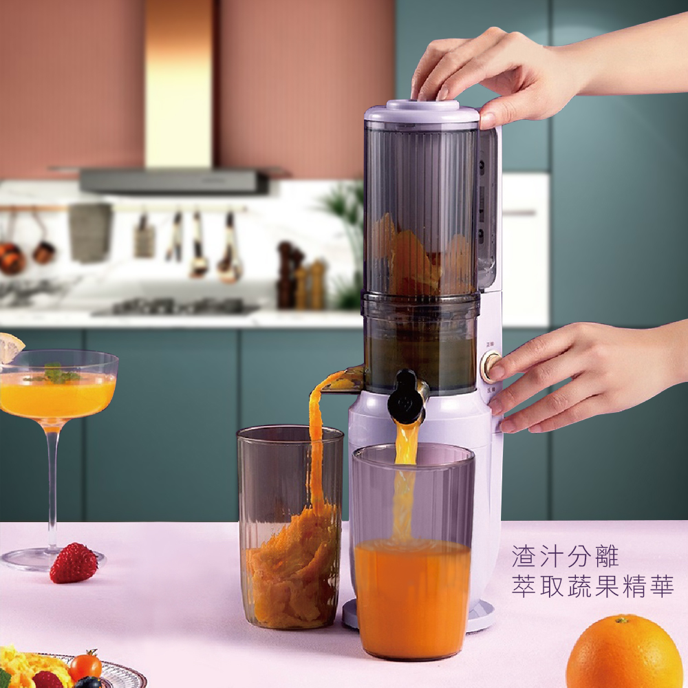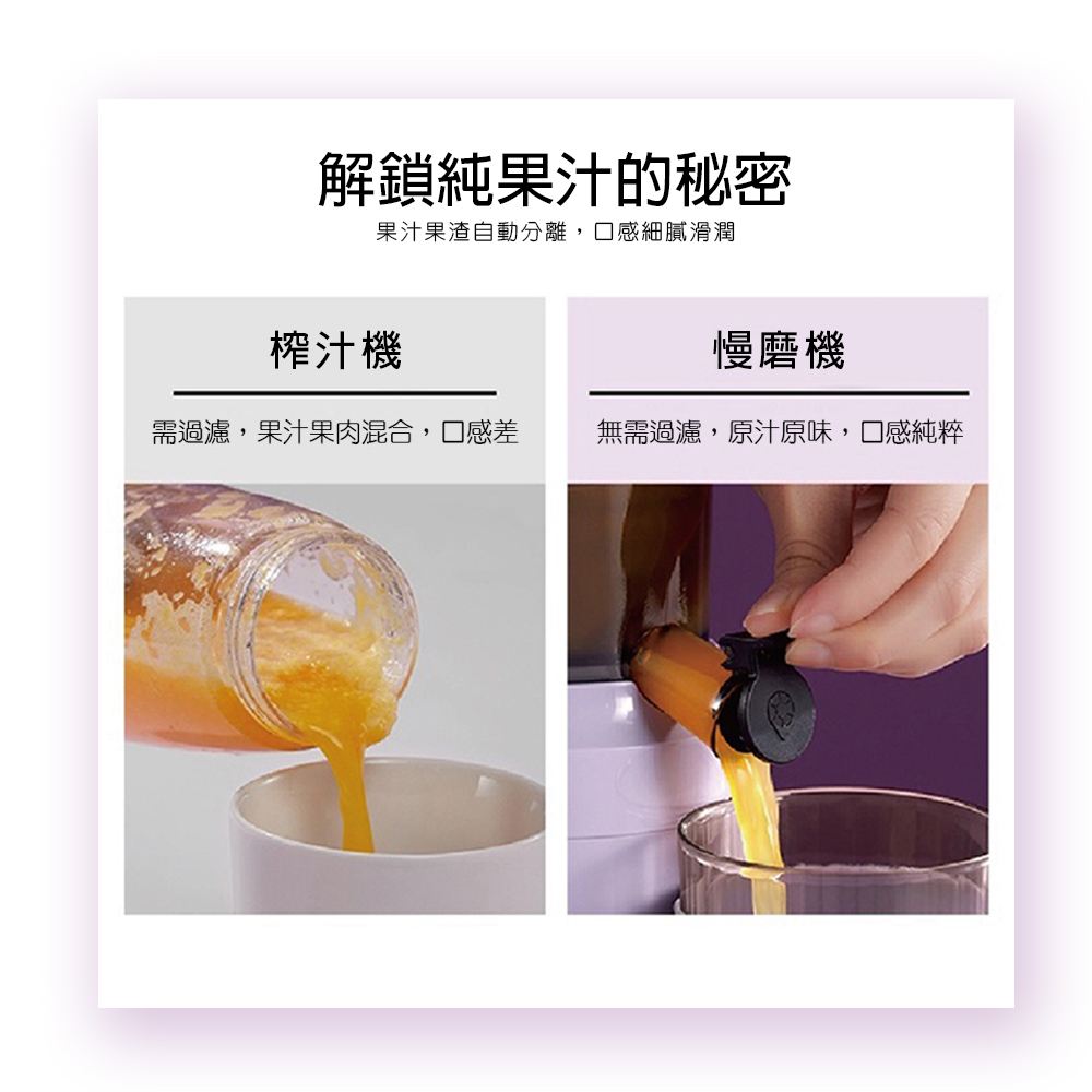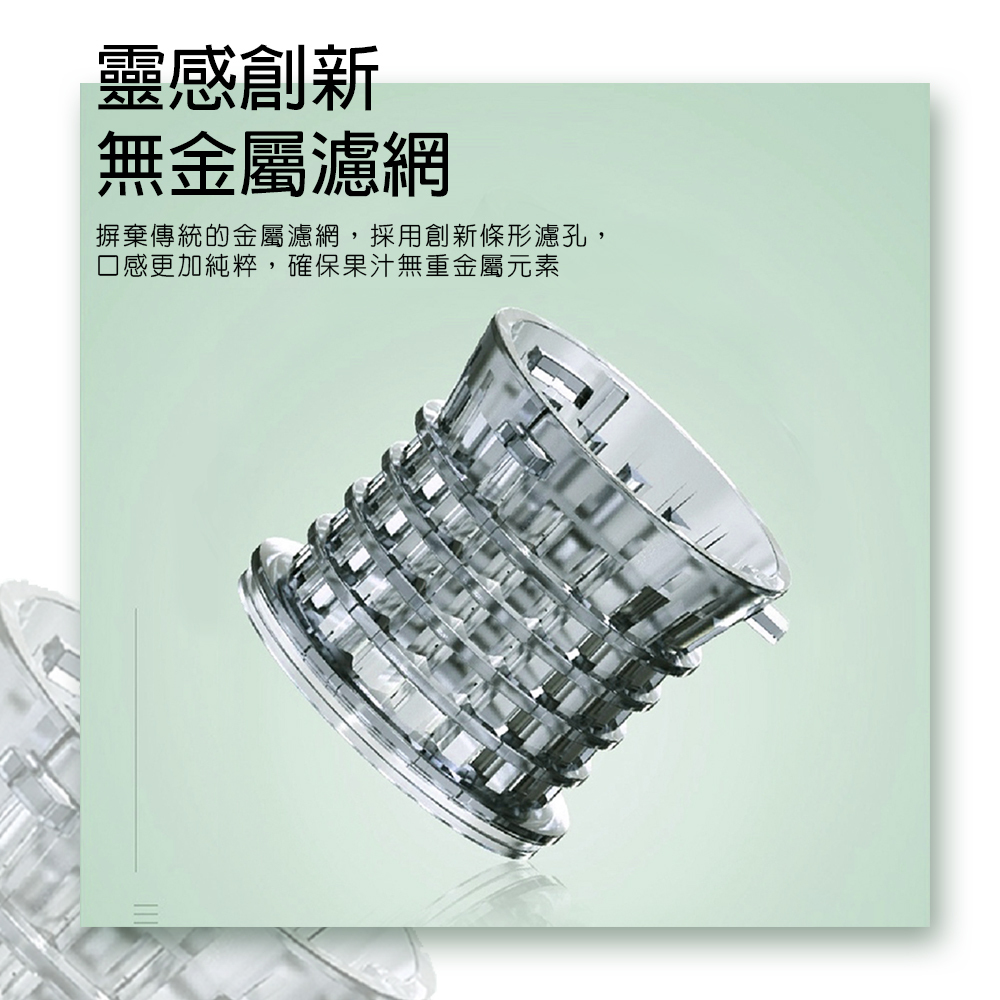 8CM大口徑入料,方便快捷。 螺壓慢萃-果汁果渣自動分離,高純度無渣感。 螺旋推壓配合條形濾網-高達95%出汁率。 低速萃取壓榨,防止高速過熱,營養流失。 新設計高密度濾網-清洗便捷口感加分。 小巧機身-方便收納,單手即可提起。 配件皆可拆卸水洗。
